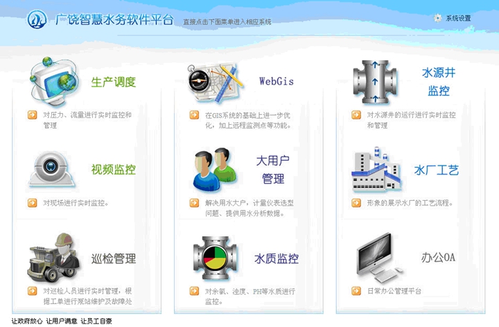 工程規(guī)模:設(shè)計規(guī)模3.5萬噸/日,新建水源井10座,改建原一廠水源井9座,均采用在線遠程監(jiān)測、控制。水廠采用地下水-清水池-消毒-二級泵房的處理工藝。綜合運用GIS技術(shù)、CAD技術(shù)、數(shù)據(jù)庫技術(shù)、網(wǎng)絡(luò)技術(shù)、管網(wǎng)綜合調(diào)度系統(tǒng)(SCADA),建設(shè)了廣饒縣GIS給水管網(wǎng)地理信息系統(tǒng),實現(xiàn)城市給水管網(wǎng)數(shù)字化全覆蓋,實現(xiàn)了城市給水全生產(chǎn)過程的信息化管理。