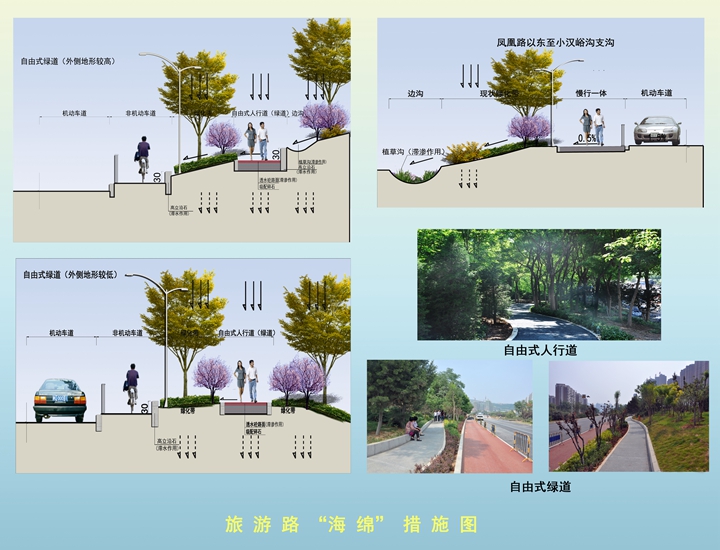 生態(tài)水塘下鋪設了60cm碎石促滲層,既加速了雨水下滲,同時也提高了蓄水能力。生態(tài)水塘內(nèi)種植了蘆葦、菖蒲、千屈菜、花葉蘆竹等水生植物,橋臺護坡進行了疊石壘砌樹池處理,種植了木槿、紫薇等花灌木,改變了原來石砌護坡裸露的灰色形象。通過實施一系列海綿設施改造建設,不僅大大緩解了旅游路雨水系統(tǒng)壓力,而且極大改善了該區(qū)域生態(tài)景觀環(huán)境,實現(xiàn)了工程建設綜合效益提升。