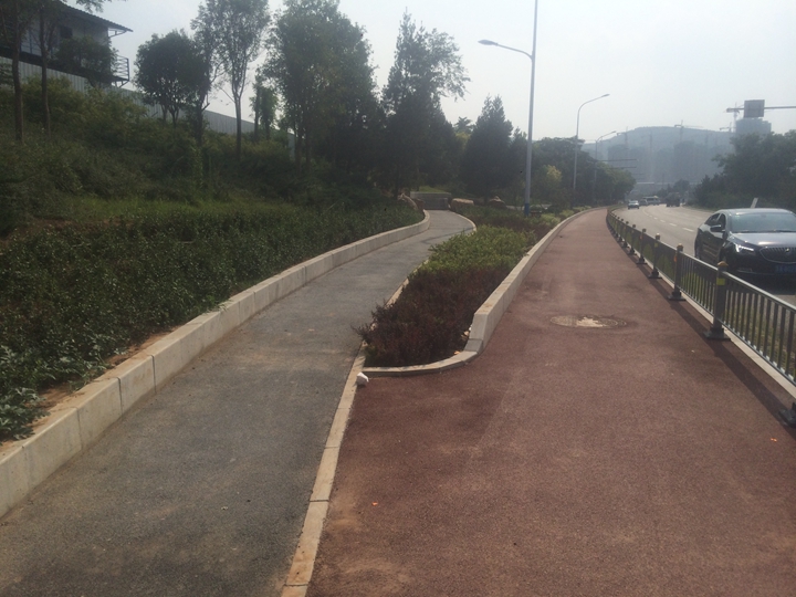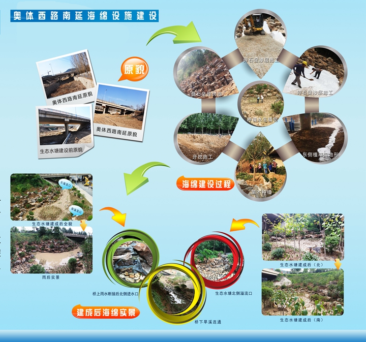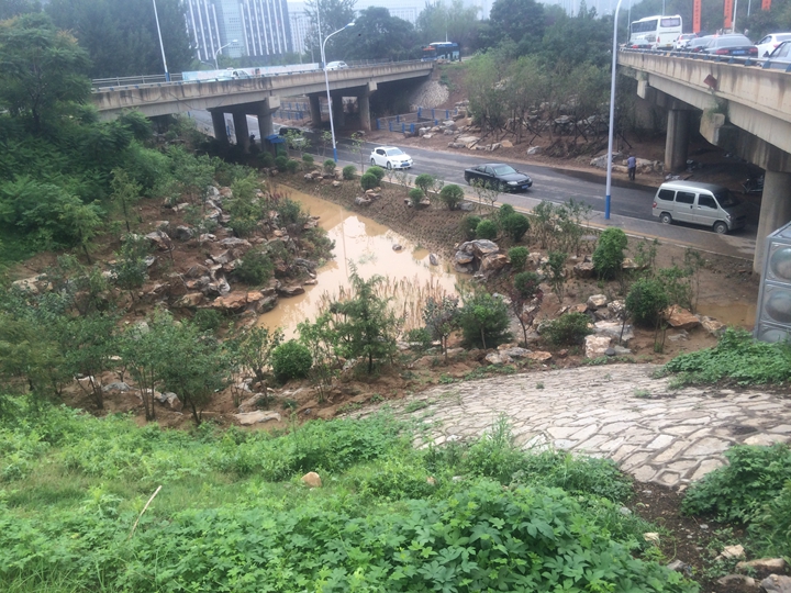 奧體西路南延原為斷頭路,道路紅線范圍及東西側空間原狀均為荒地,旅游路北橋北側原為大辛河支溝上游河道。結合本次奧體西路南延道路工程建設,充分落實海綿城市建設理念,重點對橋下空間因地制宜進行挖潛,精心設計建設了1500余平方的生態(tài)水塘、植草溝、旱溪等海綿工程設施。通過對旅游路部分路段雨水進行斷接,使上游區(qū)域雨水先進入生態(tài)水塘等設施進行生態(tài)凈化和下滲,滲后多余的雨水再溢流進入大辛河支溝,徹底改變了該路段原有的雨水直排模式。