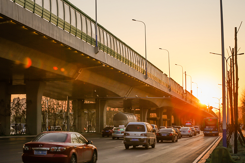工業(yè)北路快速路西起全福立交橋,東至郭店立交,長(zhǎng)13.6公里,標(biāo)準(zhǔn)段寬25.5米,雙向6車(chē)道。沿線(xiàn)共設(shè)置8對(duì)匝道,其中7對(duì)實(shí)現(xiàn)高架橋梁與地面道路的連接,在郭店立交設(shè)置一對(duì)專(zhuān)用匝道實(shí)現(xiàn)高快轉(zhuǎn)換。